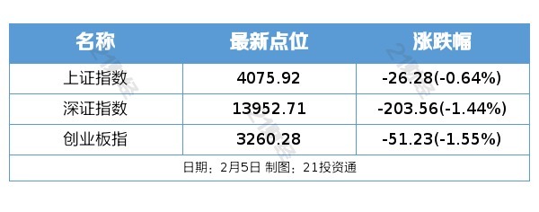 2月5日,三大指数午后跌幅收窄,此前一度跌超1%,北证50指数跌超2%。截至收盘,沪指跌0.64%,深成指跌1.44%,创业板指跌1.55%。沪深两市成交额2.18万亿,较上一个交易日缩量3048亿。
