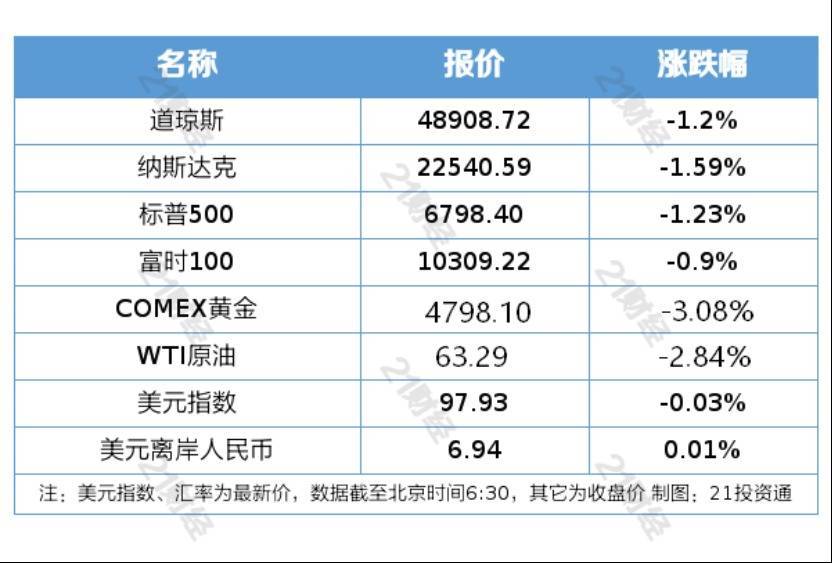 纽约股市三大股指2月5日下跌。截至当天收盘,道琼斯工业平均指数比前一交易日下跌592.58点,收于48908.72点,跌幅为1.20%;标准普尔500种股票指数下跌84.32点,收于6798.40点,跌幅为1.23%;纳斯达克综合指数下跌363.99点,收于22540.59点,跌幅为1.59%。