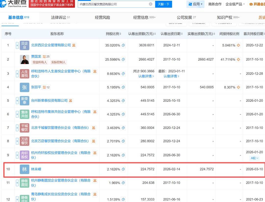 3月16日,内蒙古西贝餐饮集团有限公司发生工商变更,新增林来嵘为自然人股东,注册资本由约1.02亿人民币增至约1.04亿人民币。此次增资后,林来嵘持有西贝2.1626%股份,位列公司第十大股东。