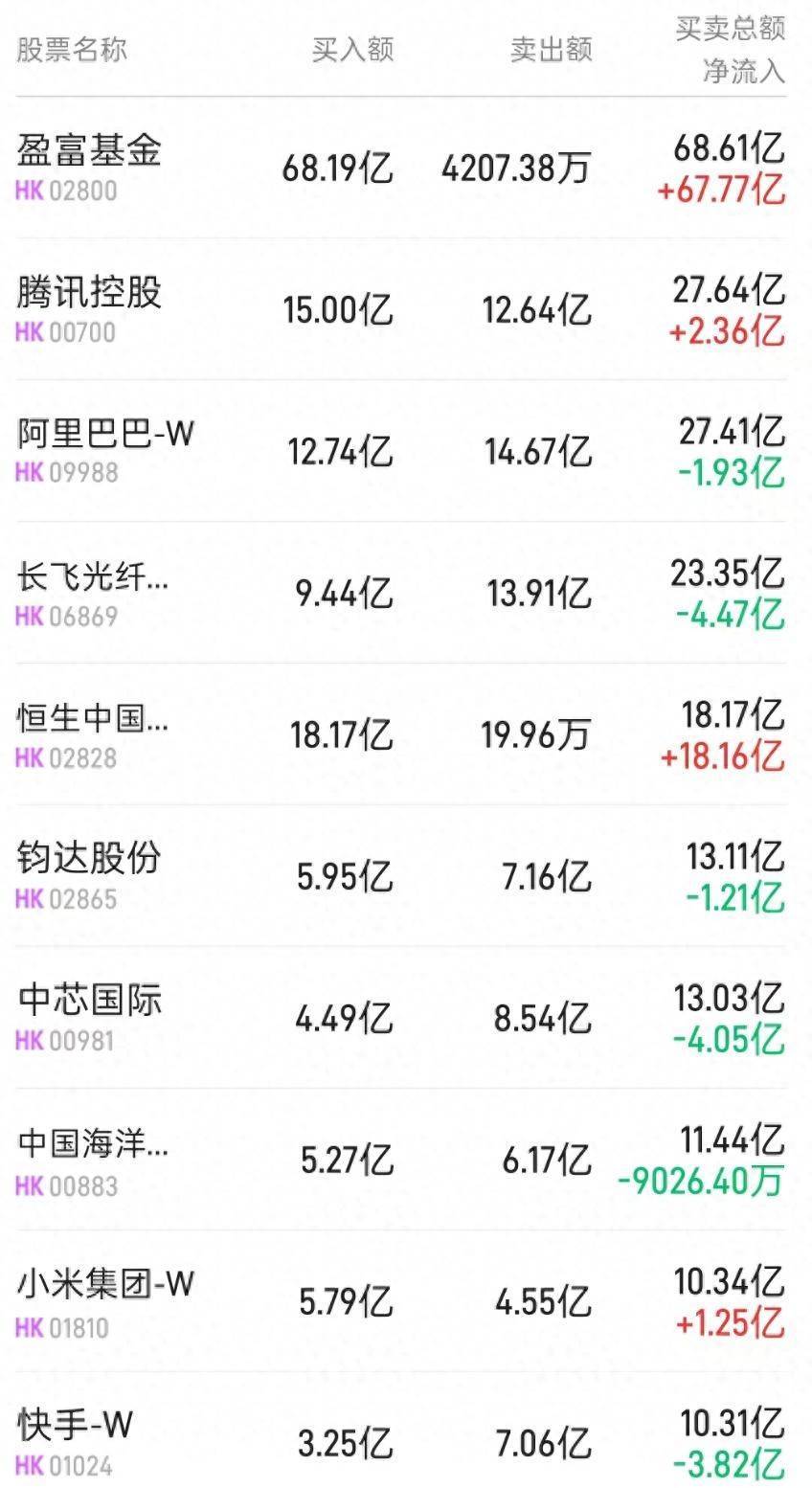 北水净买入最多的个股是盈富基金(02800)、恒生中国企业(02828)、南方恒生科技(03033)。北水净卖出最多的个股是长飞光纤光缆(06869)、华虹半导体(01347)、中芯国际(00981)。