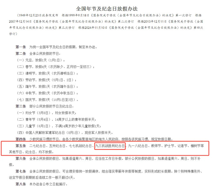 三是能让管理更规范有序。现在国家各方面管理都在不断完善,制定政策得有长远眼光,得让大家心里有底。2024 年 11 月修订、2025 年 1 月 1 日生效的《全国年节及纪念日放假办法》,就把放假安排说得明明白白,“9.3 抗战胜利纪念日” 明确不放假。这样一来,企事业单位制定年度计划、生产安排的时候,就有了明确依据,不用总猜测某个纪念日会不会放假。而且从管理层面看,规范的放假制度能让国家运转更顺畅,不会因为临时放假带来各种不确定性,这对国家长期稳定发展是很有必要的。