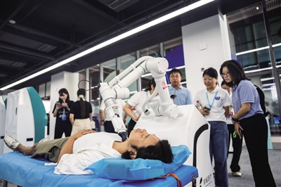 在湖南湘江新区长沙智谷,观众使用颈部超声诊断机器人进行体检。新华社记者 陈思汗 摄